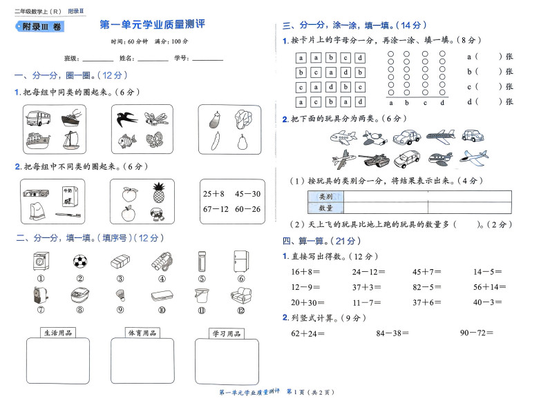 25秋小状元作业本测评卷计算三本2年级上人教版数学ST2XM03