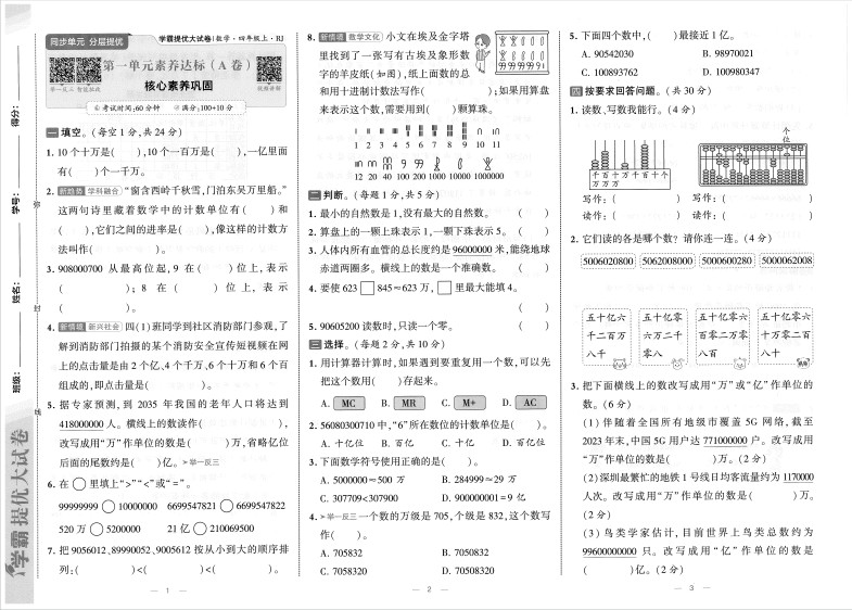 2025秋学霸提优大试卷 数学人教版4上ST2XM0404