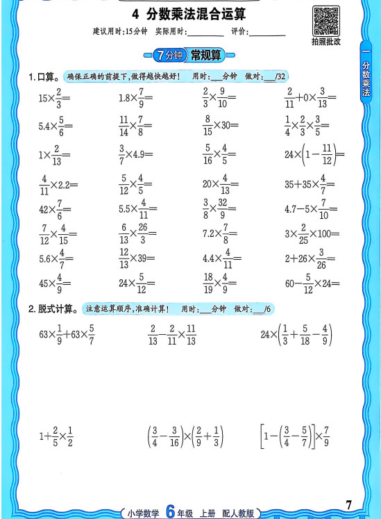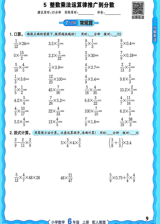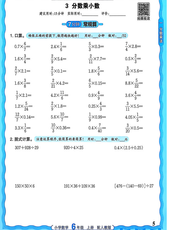 新版人教版数学六年级上册活页计算ST2XM0806